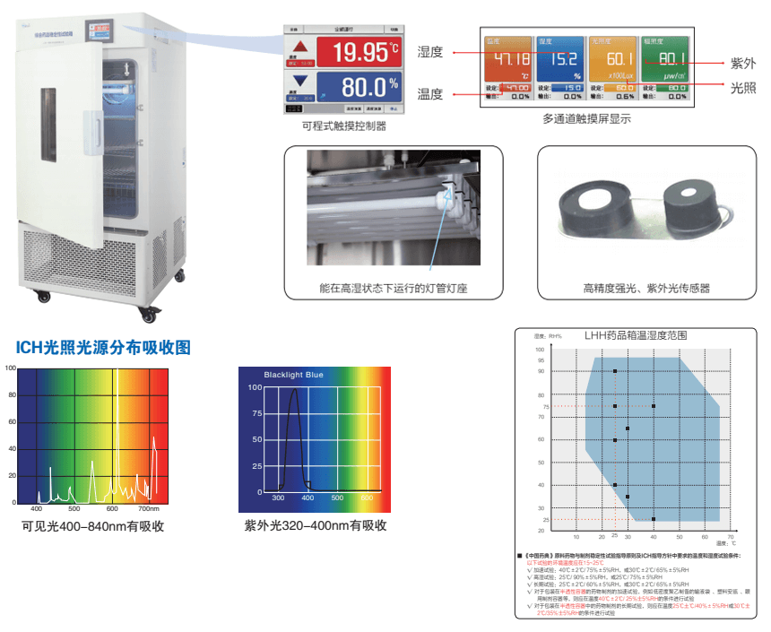 產品特點 綜合藥品光穩定性試驗箱的光照系統 ● 綜合藥品光穩定性試驗箱的光照系統符合lCH中關于Q1B新原料藥和新制劑的光穩定試驗要求也符合相應國 際制造標準,滿足2020藥典藥物穩定性試驗指導原則。以科學的方法模擬一個對藥品失效期測評所需要的 長時間穩定的溫度、濕度及光穩定性試驗環境。適用于制藥企業對新原料藥和新制劑的溫濕度和光穩定性試 驗要求。